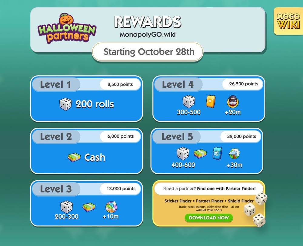 ⚠️ Important: To unlock all rewards, both you and your partner need to actively participate throughout the event. Be sure to find a dependable partner before the event starts! You can use Partner Finder in Monopoly Go to connect with other players.